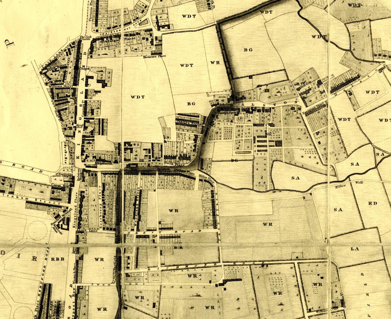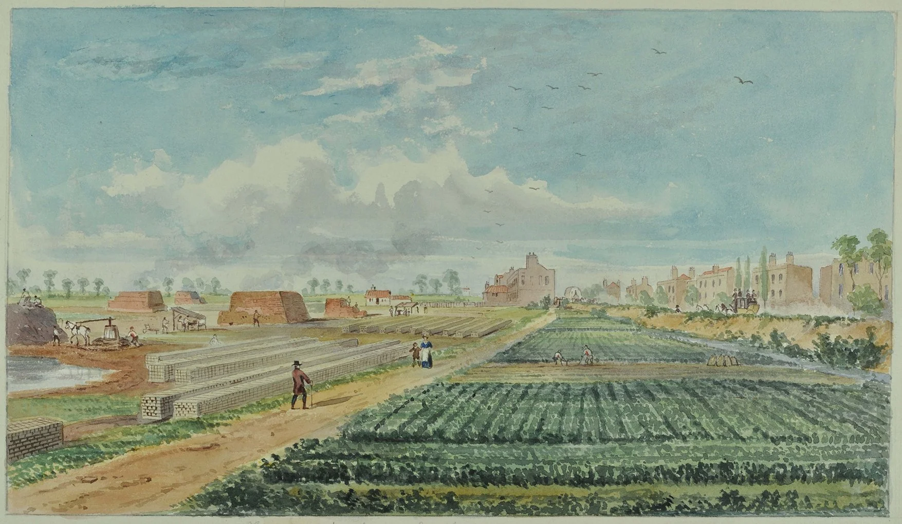 This watercolour of an area between Balls Pond Road and Kingsland Road (c1810) shows both the exploitation of the land for making brick (from local brick earth) alongside market gardens. Credit London Archives ref. 302827.