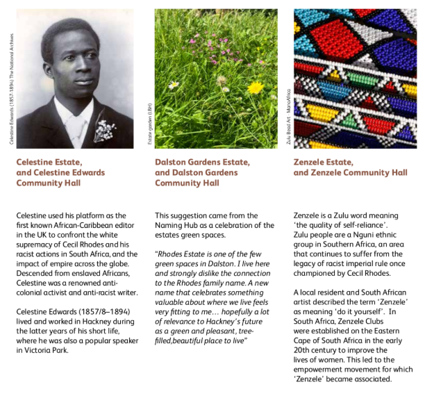 The TRA requested support from Hackney Council to understand the name of Rhodes and if it did have a connection with the imperialists; and to support a consultation with its residents regarding a potential name change. This was managed through the Review, Rename and Reclaim programme.
